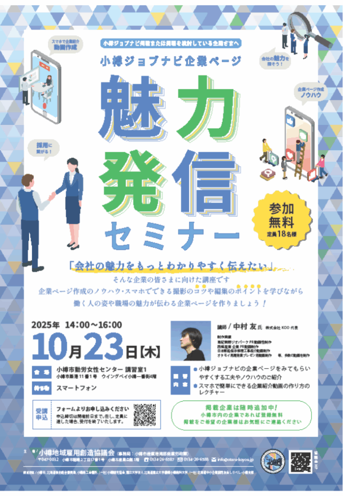 小樽ジョブナビ掲載または掲載を検討している企業を対象に 小樽ジョブナビ企業ページ「魅力発信セミナー」 を開催します。 スマホだけで、会社の魅力をもっと伝わりやすく。 動画づくりの経験がなくても大丈夫。講師が […]