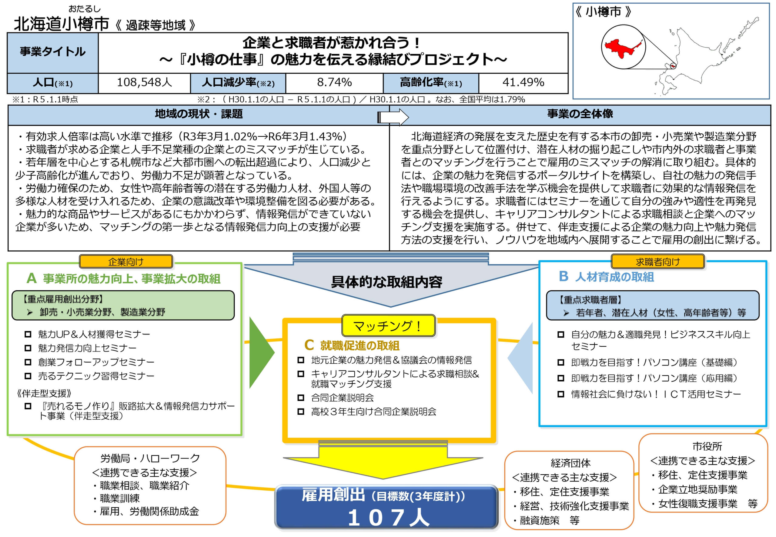 「企業と求職者が惹かれ合う!~『小樽の仕事』の魅力を伝える縁結びプロジェクト」と題し、卸売・小売業や、製造業分野を重点分野と位置づけ、①「事業所の魅力向上・事業拡大の取組」、②「人材育成の取組」、③「就職促進の取組」の3つの事業に取り組んでまいります。